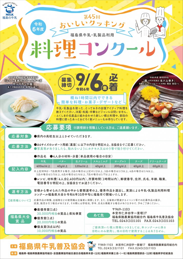 ◇主催:福島県牛乳普及協会 ◇後援:福島県/福島県酪農業協同組合/全国農業協同組合連合会福島県本部/(公社)福島県栄養士会/(公財)福島県学校給食会 【募集対象】 高校生以上 【応募方法】 料理コンクール応募用紙に必要事…